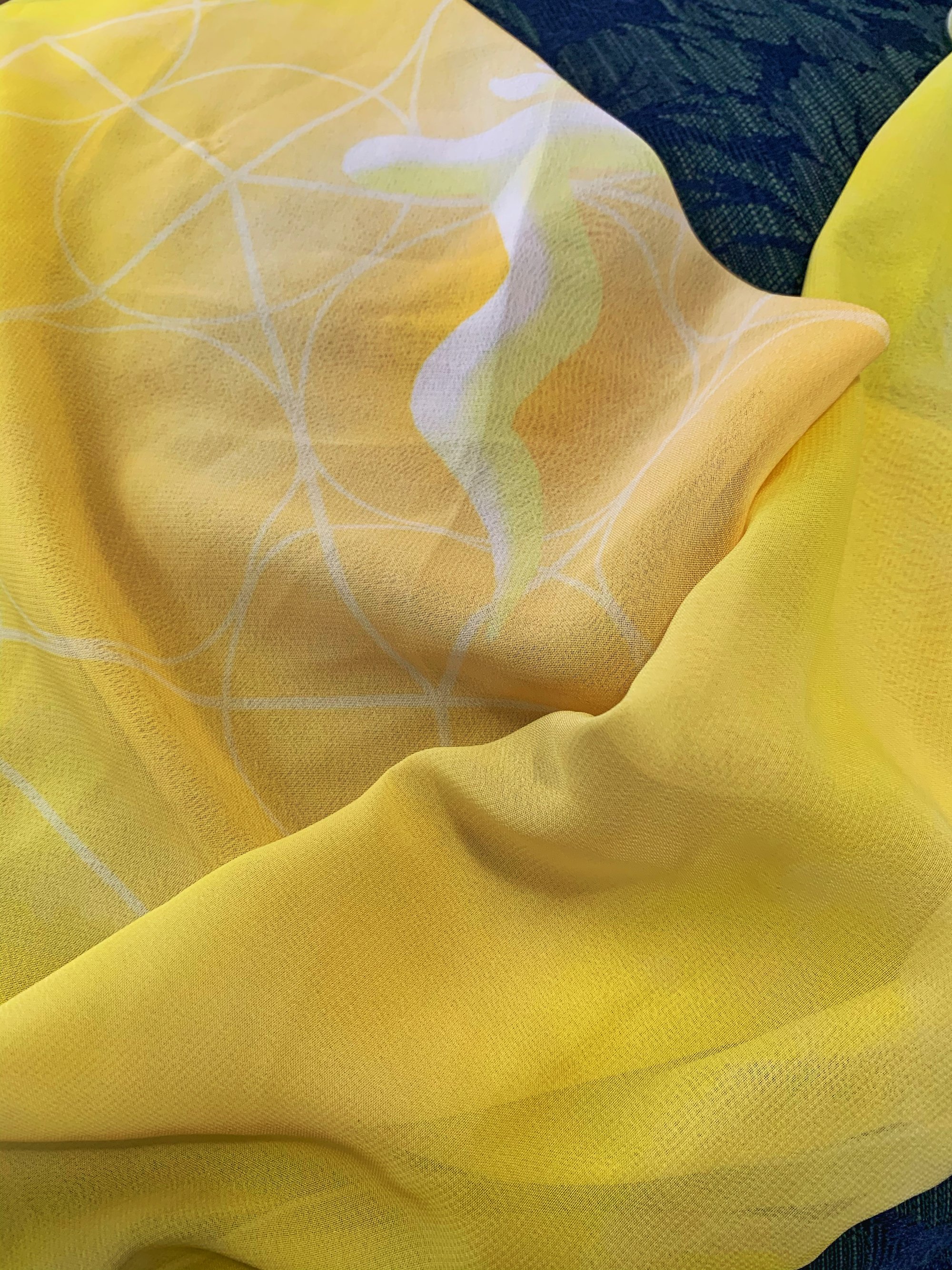 This scarf is made of chiffon and can be used as scarf or oracle deck cloth. It is soft and is ideal for a spread of oracle cards. In euro you will pay 22.50 and in cad it costs 35 plus shipping. There are only 6 of them so far. f you are interested send me a message. It is self designed by me and represents the soft energy of the solar plexus chakra.